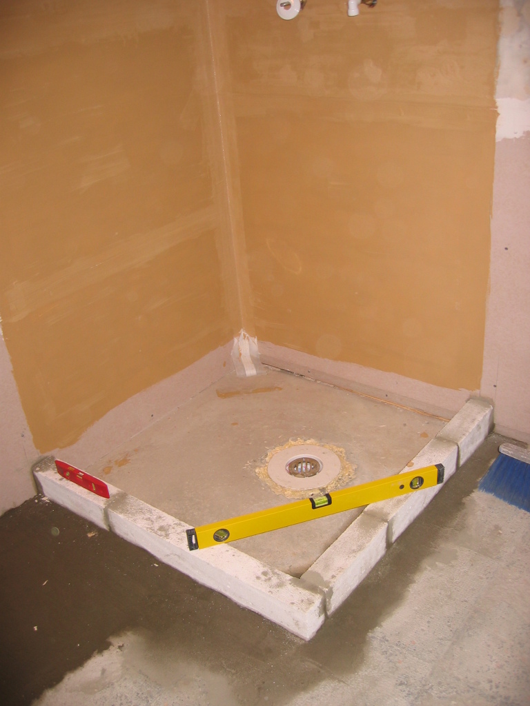 On the first image you see how the cheap fucks installed the tray: drop it on the concrete slab, glue in a collar for the final drain with a badly made puddle flange, then simply pour in about 4cm of tile mortar and plop the tiles in. Presto, instant shower, and off they were to the next lousy job.