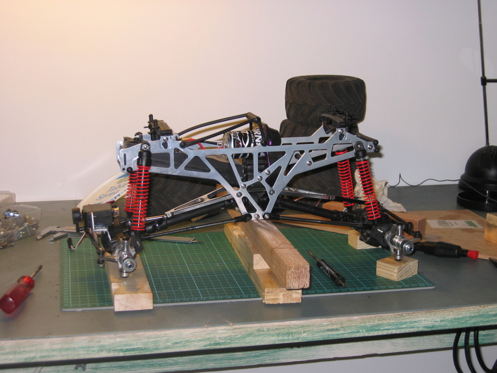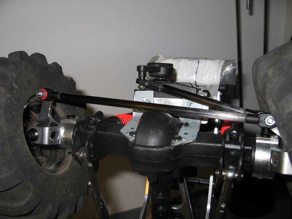 The long rods I used as the lower links, which gives me a nice 34cm wheelbase (way up from the stock 23cm), and the shorter links are spare for now. I didn't have to cut the drive shafts (as other people reportedly had to when aiming for a 12.5" wheelbase).
