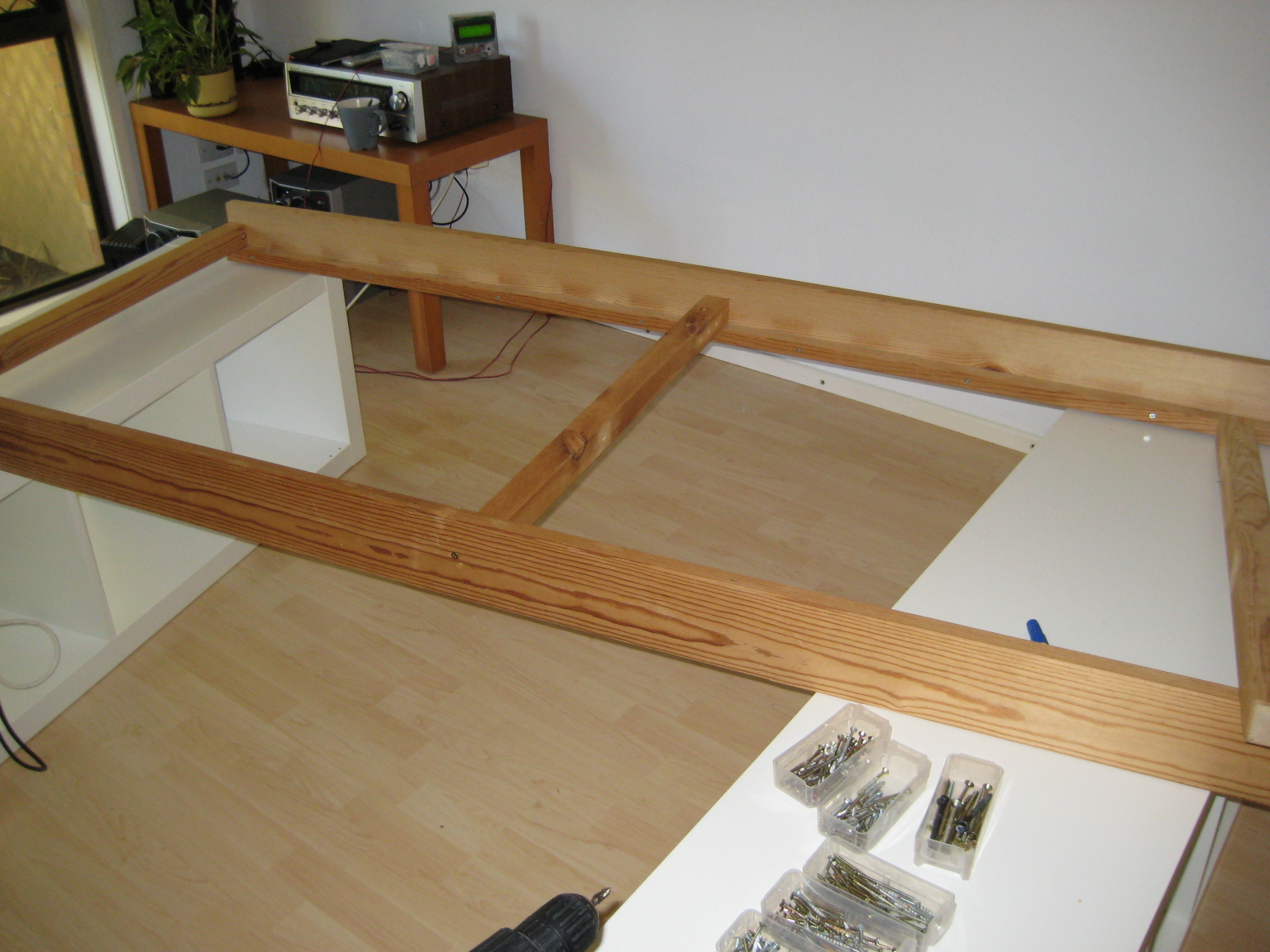 For the new head board I planned to use three Lack tables, straight and side by side. Which is admittedly very boring. But luckily Conny had some much better (and more adventurous) ideas and I did listen: one can cut even the cheap hollow Lack legs with a circular saw and reassemble them into something nice if one is a little careful. After we decided on a design we simply assembled the Lack tables into a triple pack and fixed that to the extension board with long screws.