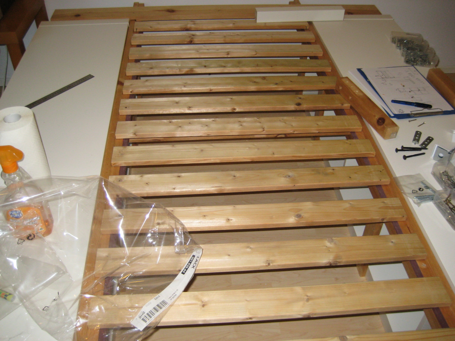 The plan was to reuse the old frame rails as just that, but narrowed and nestled inbetween the Expedits. The slats came in halves originally, and a quick check showed a perfect fit: Expedits plus half slats plus frame rails gives precisely 160cm width. Me happy.