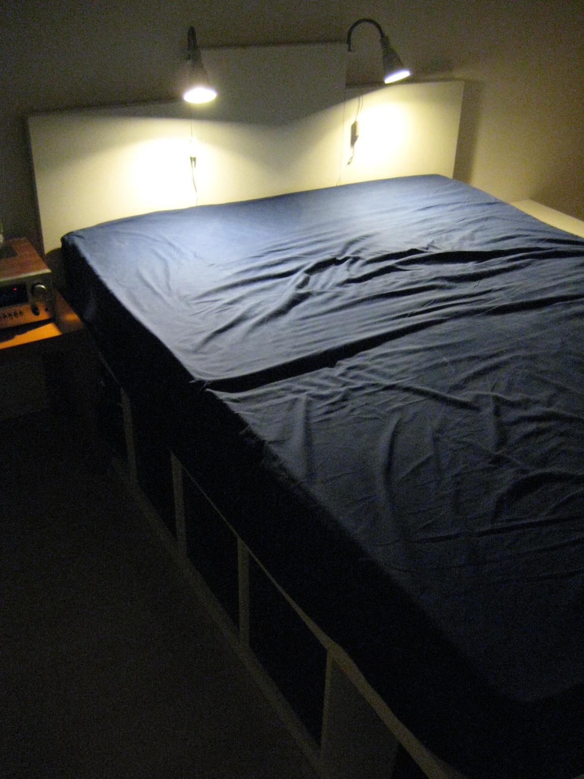 The old bed was a cheapie Ikea unit, about ten years old by now - and not bad per se but too low: just high enough to make cleaning underneath annoying while not being high enough to make the space really useful.